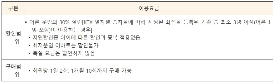 코레일멤버십 회원 중 만 25세 미만 자녀 2명 이상을 둔 회원을 운임을 할인받을 수 있습니다.