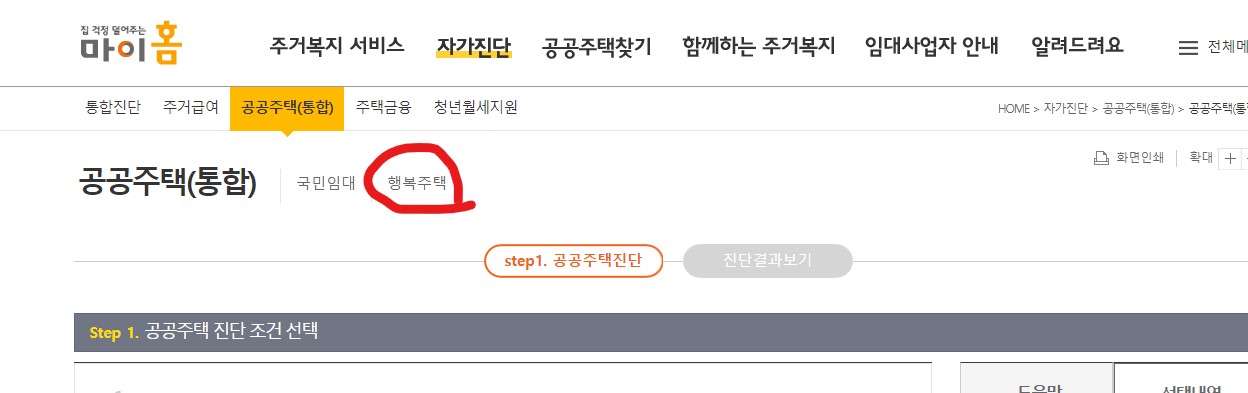 마이홈 홈페이지 -> 자가진단 > 공공주택(통합) -> 행복주택 -> 자가진단조건 선택